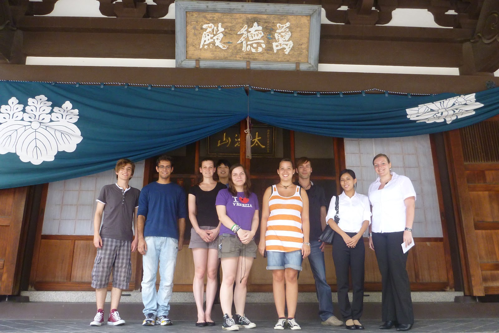 We started from school at 1 o`clock and went to Ankokuji Temple. The students took photos and Abe-san showed us how to pray in the temple. Afterwords we took a group picture in front of temple on the stairs. The next stop was the 100 Yen shop.