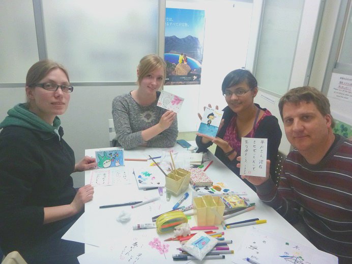 Today, we tried to design and draw a picture postcard as an activity. We enjoyed drawing the seasonal flowers and characters with paint and calligraphy pens. And we wrote messages on the postcards. Everyone likes Japanese animation, especially “GHIBLI”. All of the works are so amazing. Painting and calligraphy are good for a breather, and it is up to you what you draw. So if you have free time I recommend trying it.