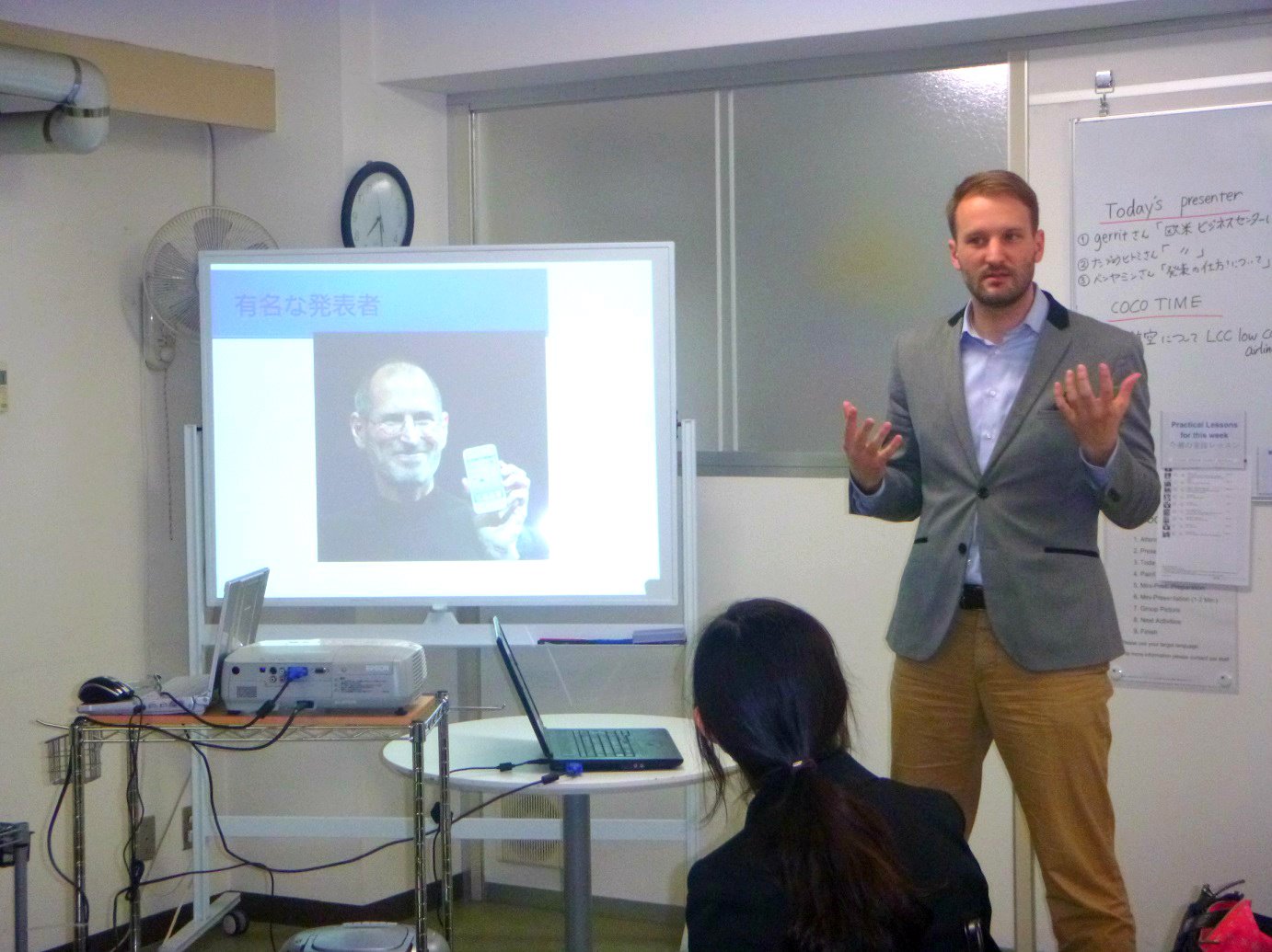 We had two presenters at yesterday’s Open School. The first presentation was from one of our university interns about the Obei Business Center, where she did her internship. She wants to become an elementary school teacher in the future. We wish her the best that her dream comes true. The next presentation was about “How to make a presentation” using the example of Steven Jobs. As always, Benjamin did a very good job speaking fluent Japanese.